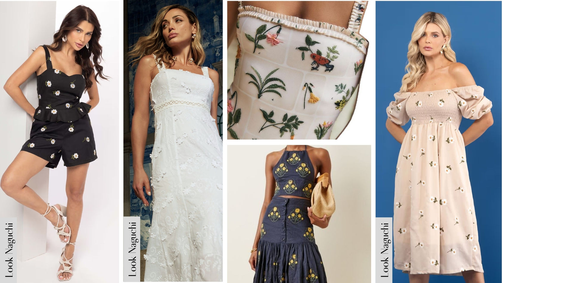 O floral bordado é chave para quem gosta de propostas mais românticas e boho. Ótima opção para combinar com sandálias rasteiras, anabelas ou flatforms de palha. As peças de tons claros são perfeitas para usar em eventos durante o dia, enquanto as de base escura são ideais para eventos a noite, podendo combinar com acessórios mais pesado e menos delicados, contrastando com a peça.