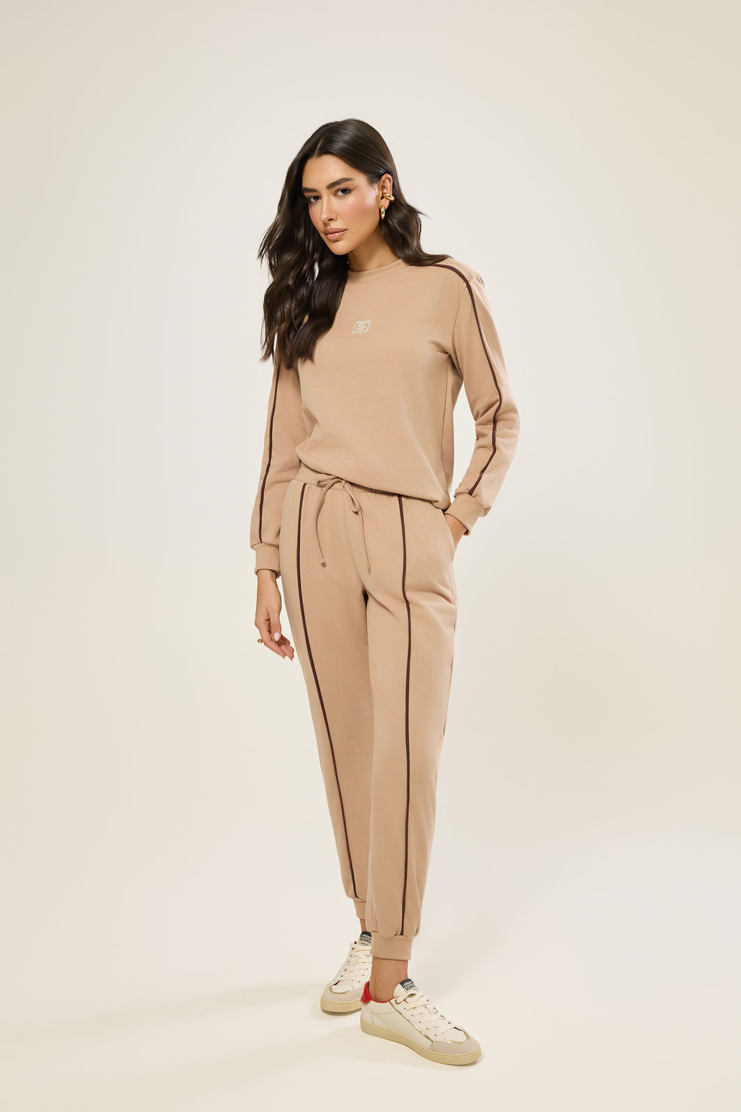 Blusa manga longa em malha de moletom felpado. Possui punho de ribana e filete contrastante nas mangas. Detalhe de etiqueta decorativa personalizada na frente da peça. Veste mais soltinha ao corpo. Composição: 50% Algodão, 50% Poliéster. MEDIDAS DA MODELO: *MODELO VESTINDO TAMANHO P/36 NA FOTO*.