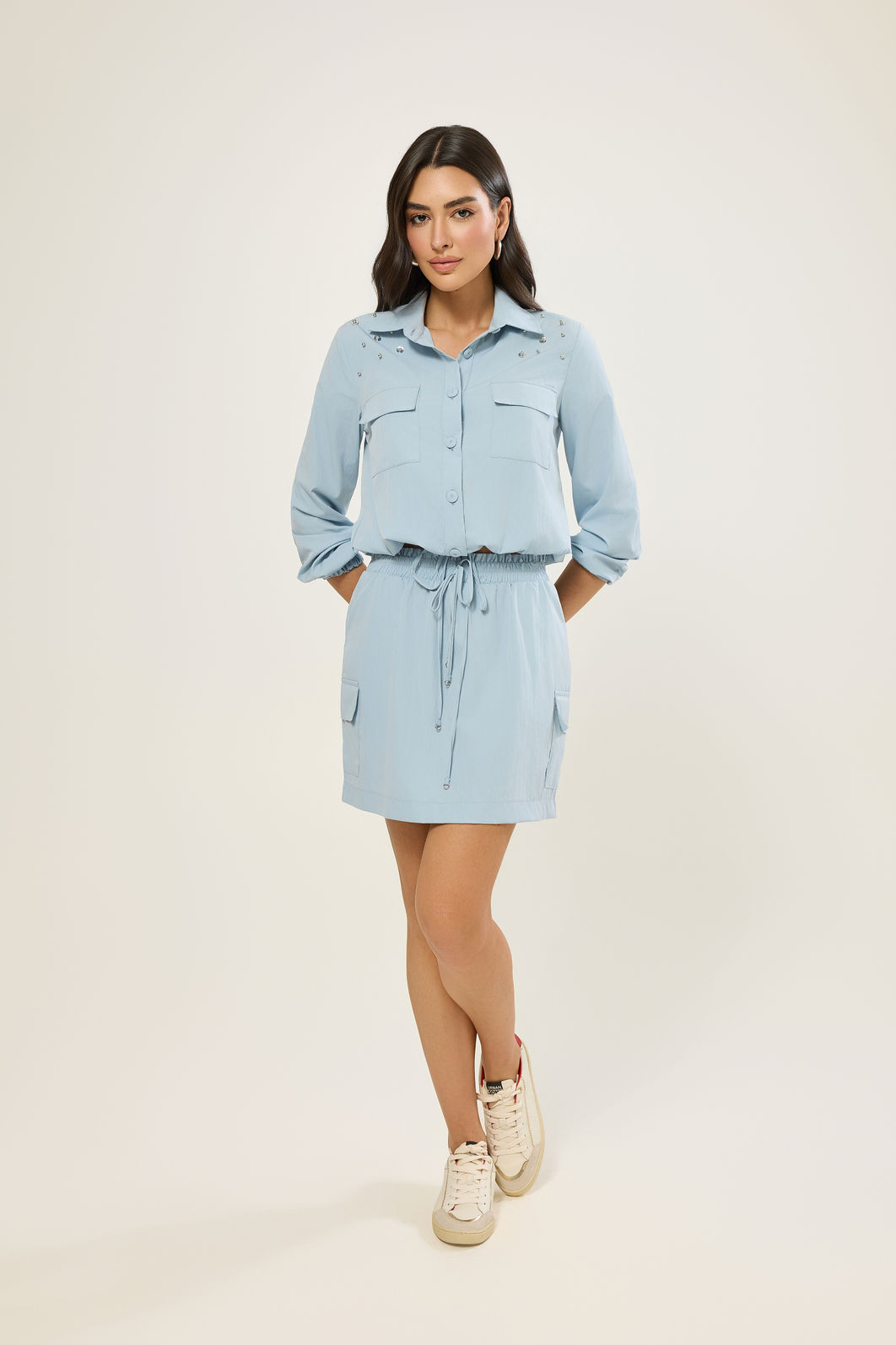Saia curta estilo cargo em tecido nylon tech. Detalhe de bolsos nas laterais e cós franzido de elástico com laço acompanhado de argola metalizada. A peça veste mais soltinha ao corpo. Composição: 73% Poliéster, 27% Poliamida. MEDIDAS DA MODELO: *MODELO VESTINDO TAMANHO P/36 NA FOTO*.